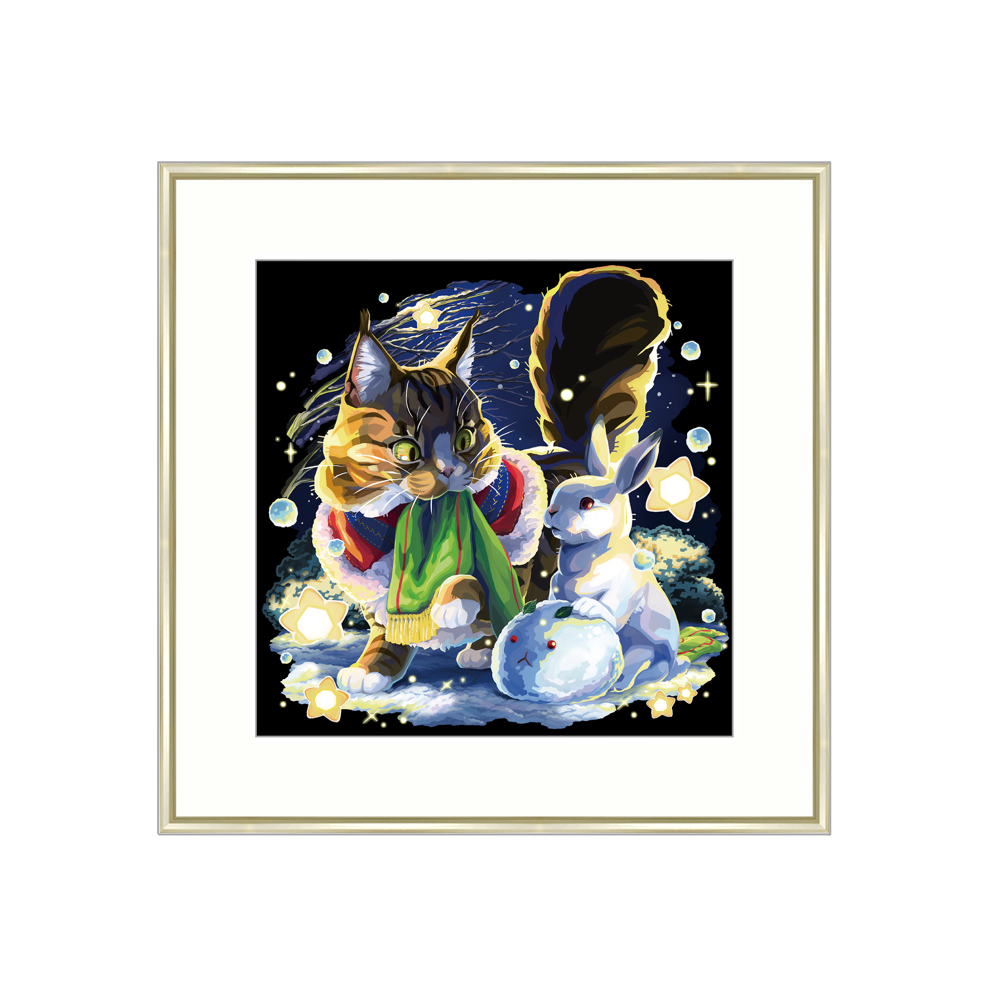 【受注生産】ユキウサギと猫_アートプリント_額有り250mm角